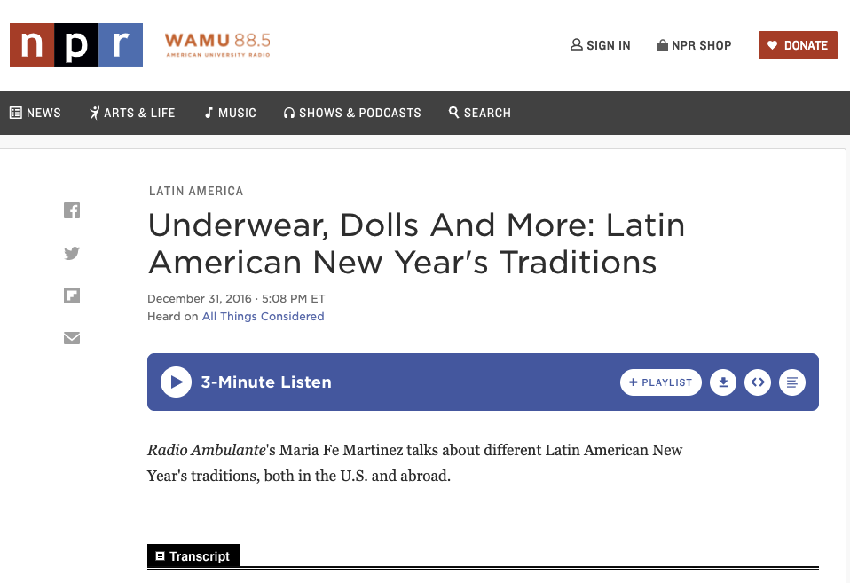 Managed the logistics and production details of NPR’s Radio Ambulante live shows in Washington DC and Brooklyn, New York. Both shows took place in September 2018, were completely sold out and received great comments from showgoers.Reporting and photos for a Vice story on how Queens is a usually overlooked destination for tourists.What Have You Done for Yourself Lately? on Supportal, an homage to a friend who showed up in the best way during a difficult time in my life.Reporting and photographs for Somos on feature piece about the Peruvian Señor de los Milagros devotion in Paterson, New Jersey.Feature piece on the film Jackie, including interviews with Natalie Portman and director Pablo Larraín.Feature piece on the film The SpongeBob Movie: Sponge Out of Water for Somos,including interviews with Antonio Banderas and director Paul Tibbit.